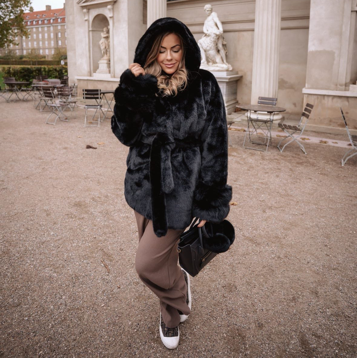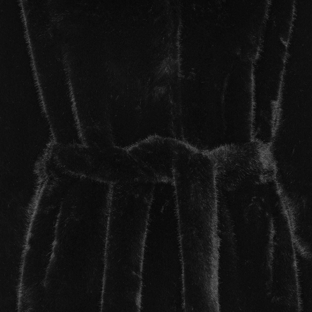 Denne sorte jakke er designet i blød faux fur med en smuk dyb glans, der giver et eksklusivt look. Den brede hætte tilfører både elegance og funktionalitet.